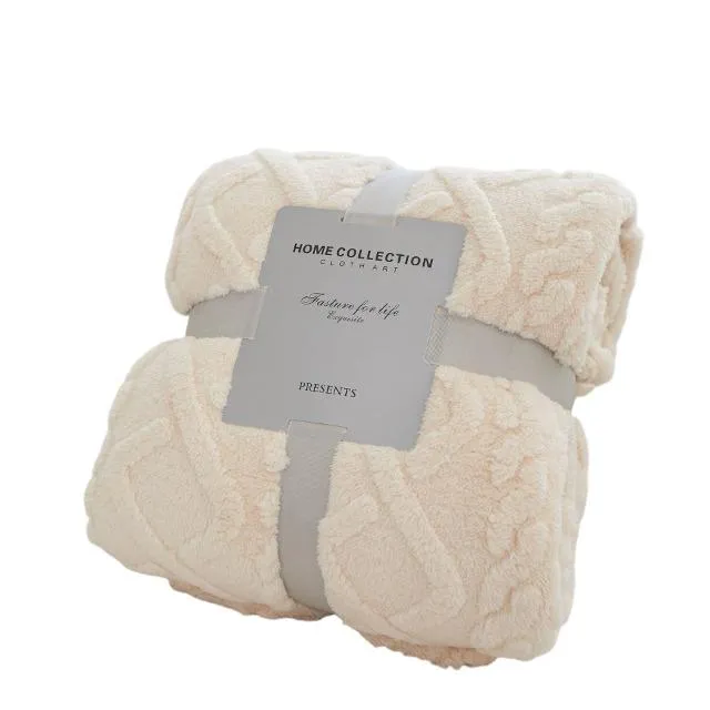 おしゃれなケーブルニットデザインのブランケット。肌寒い季節にぴったりです。 ※商品管理のためパッケージやタグに直接バーコードシールを貼り付けさせていただく場合がございます、予めご留意ください。
